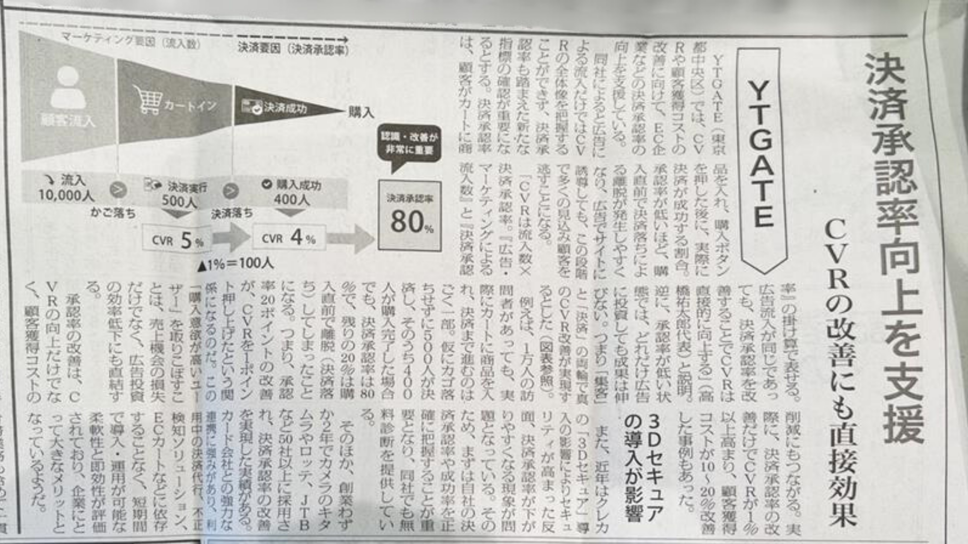 記事タイトルは、『YTGATEが決済承認率向上を支援、CVRの改善にも直接効果』です。