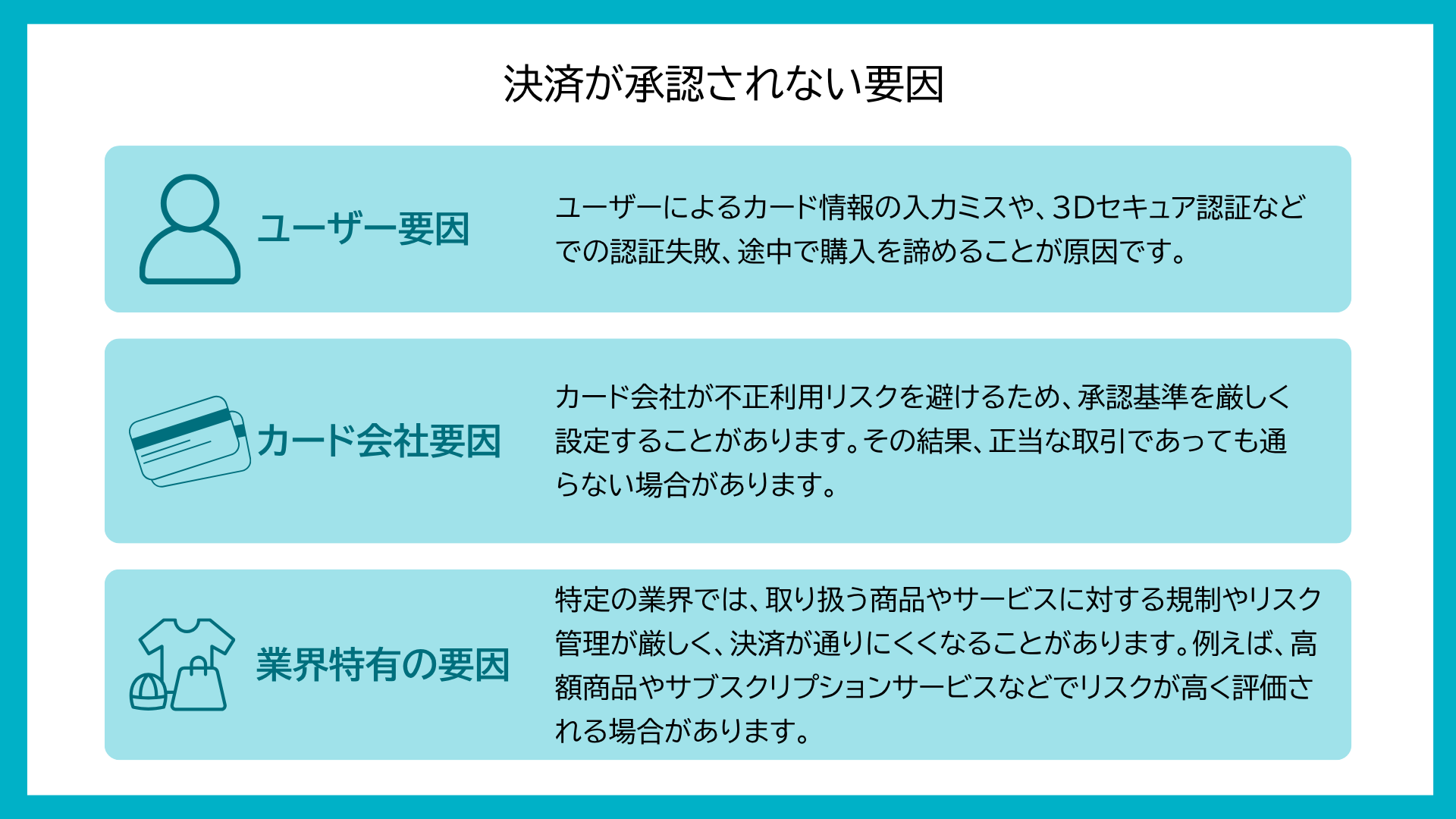 高橋:複数の要因があります。多くの方は「与信枠があれば100%通る」と考えがちですが、実際には80%や50%しか通らないケースも珍しくありません。これは与信枠の問題ではなく、カード会社やユーザー側の事情、さらには業界特有の要因が絡んでいます。